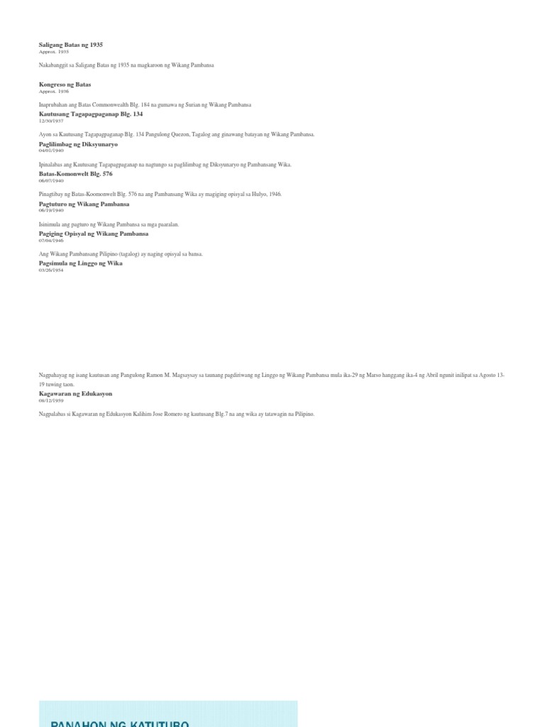 Magsaysay sa taunang pagdiriwang ng Linggo ng Wikang Pambansa mula ika-29 ng Marso hanggang ika-4 ng Abril ngunit inilipat sa Agosto 13-19 tuwing taon. Butte Bise Gobernador Kalihim ng Pampublikong Edukasyon 1930 1935 SALIGANG BATAS. Magkakabisa ang proklamasyong ito dalawang taon matapos itong mapagtibay.