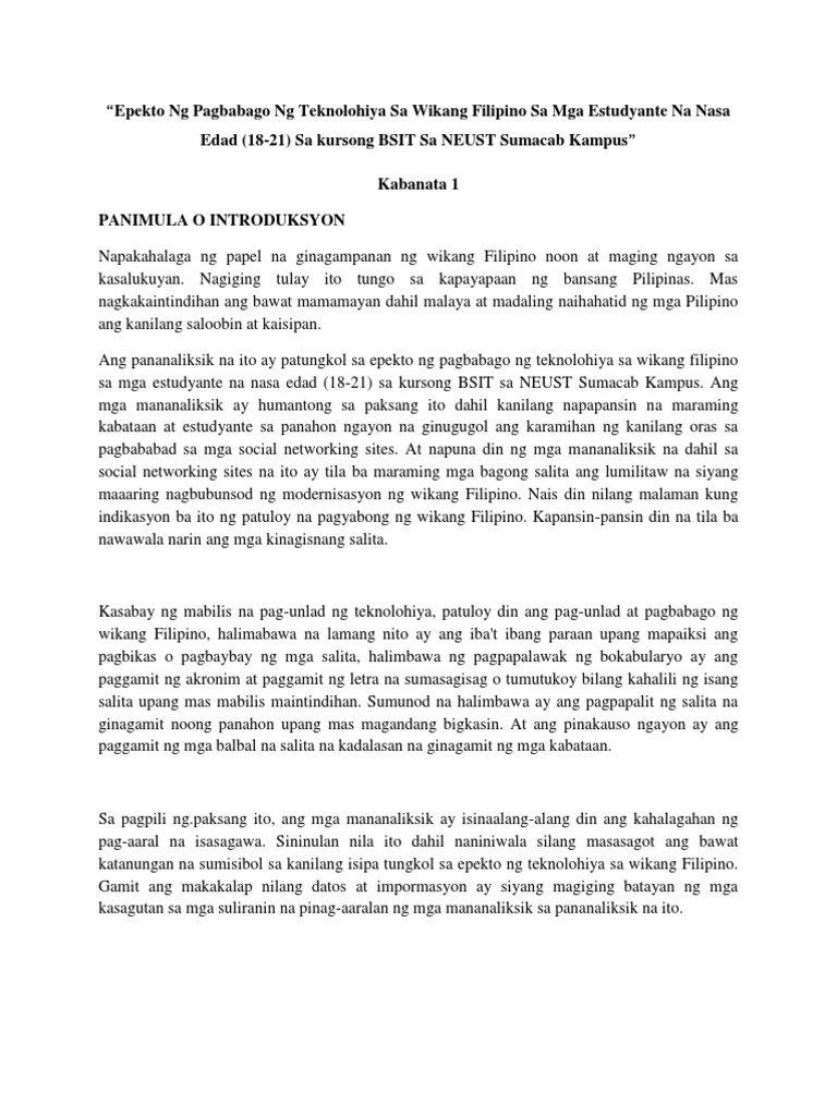 Epekto Ng Pagbabago Ng Teknolohiya Sa Wikang Filipino Sa Mga Estudyante Na Nasa Edad 1 Docx U201cepekto Ng Pagbabago Ng Teknolohiya Sa Wikang Filipino Course Hero
