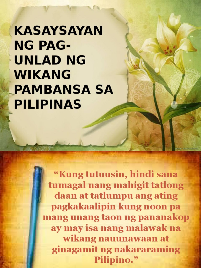NG PAGUNLAD NG WIKANG PAMBANSA SA PILIPINAS. Isang arkipelago ang Pilipinas kung kaya nagkaroon ito ng maraming katutubong wika. 1772012 bilang mag-aaral malaki ang maitutulong ng pag-aaral ng kasaysayan dahil mas lumalawak ang ating kaisipan at nalalaman natin ang mga kaganapan noon na pwede nating maihalintulad sa kasalukuyan.