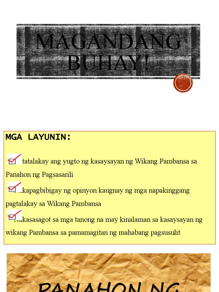 2092018 Sa panahon ng pananakop ng mga Hapon Ipinagamit ang mga katutubong wika sa pagsulat ng mga akdang pampanitikan. Agostos 13 1959 Pinalitan ang tawag sa wikang pambansa mula sa TAGALOG PILIPINO sa bisa ng kautusang Pangkagawaran Blg.